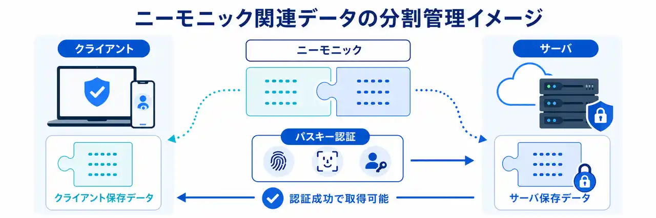 秘密鍵復元に必要な 「ニーモニック(シードフレーズ) 」に関連するデータを、サーバとクライアントに分割して保存し、サーバのデータはパスキー認証に成功することで取得可能となります。 |
