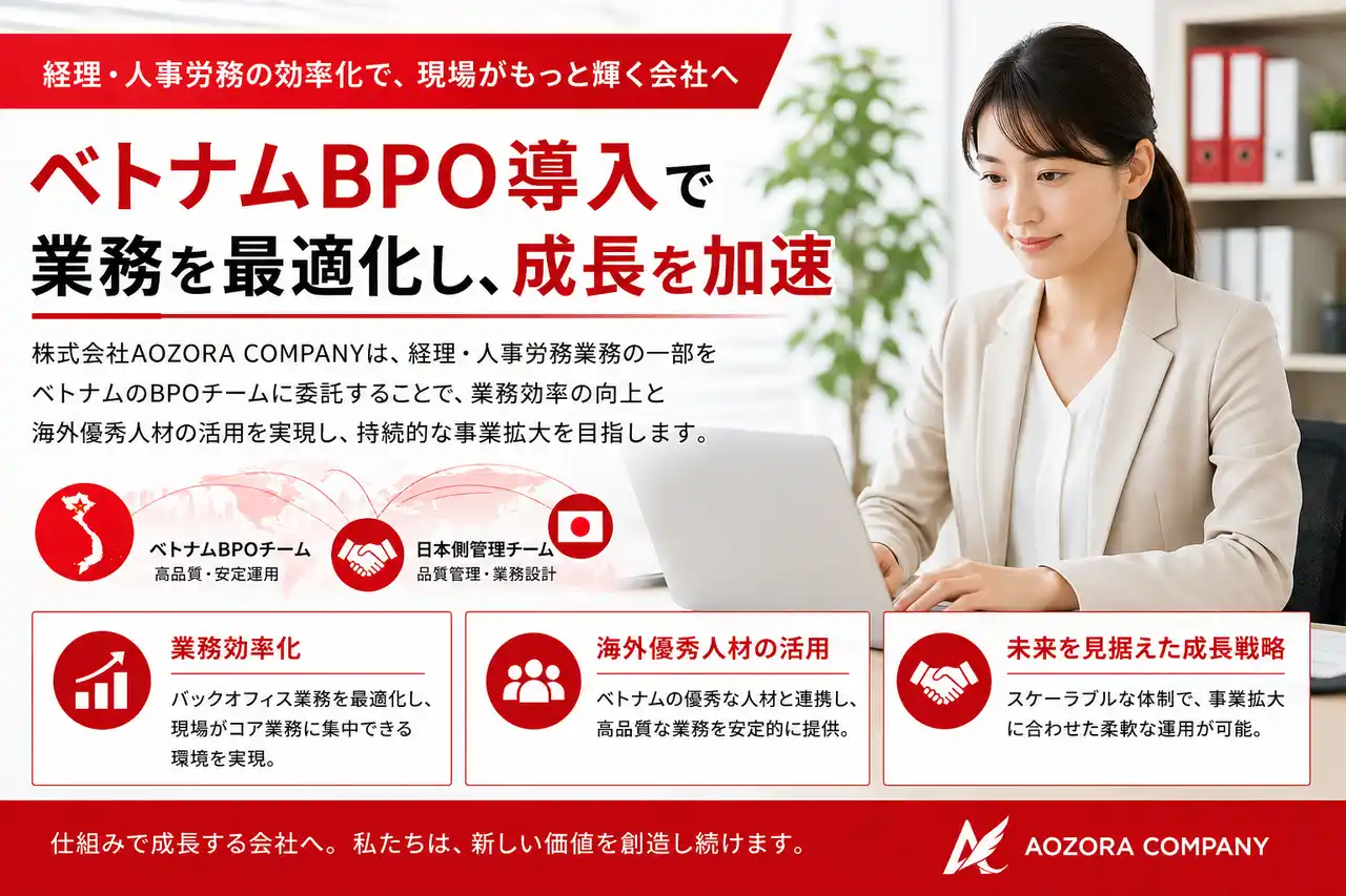 株式会社AOZORA COMPANY(本社:新潟県新潟市、代表取締役:高橋拓巳)は、経理および人事労務業務の効率化と高度化を目的として、ベトナムを拠点としたBPO(ビジネス・プロセス・アウトソーシング)体制を構築したことをお知らせいたします。 |