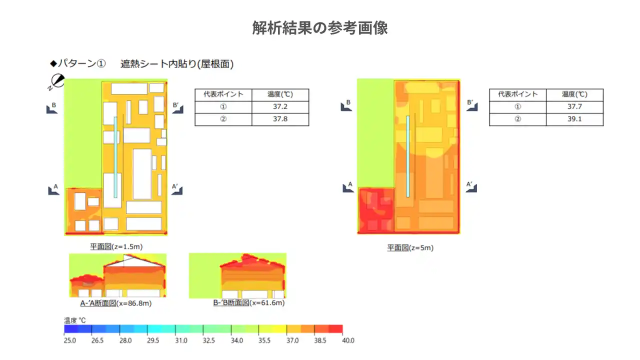 この工場の場合、屋根面だけでも約‒ 2℃の低下が見込める一方で、窓を加えても効果の上乗せは小さいことがわかります。つまり、「屋根だけで十分なのか、壁までやるべきなのか」を数値で判断できるため、不要な過剰投資を避けられます。 |