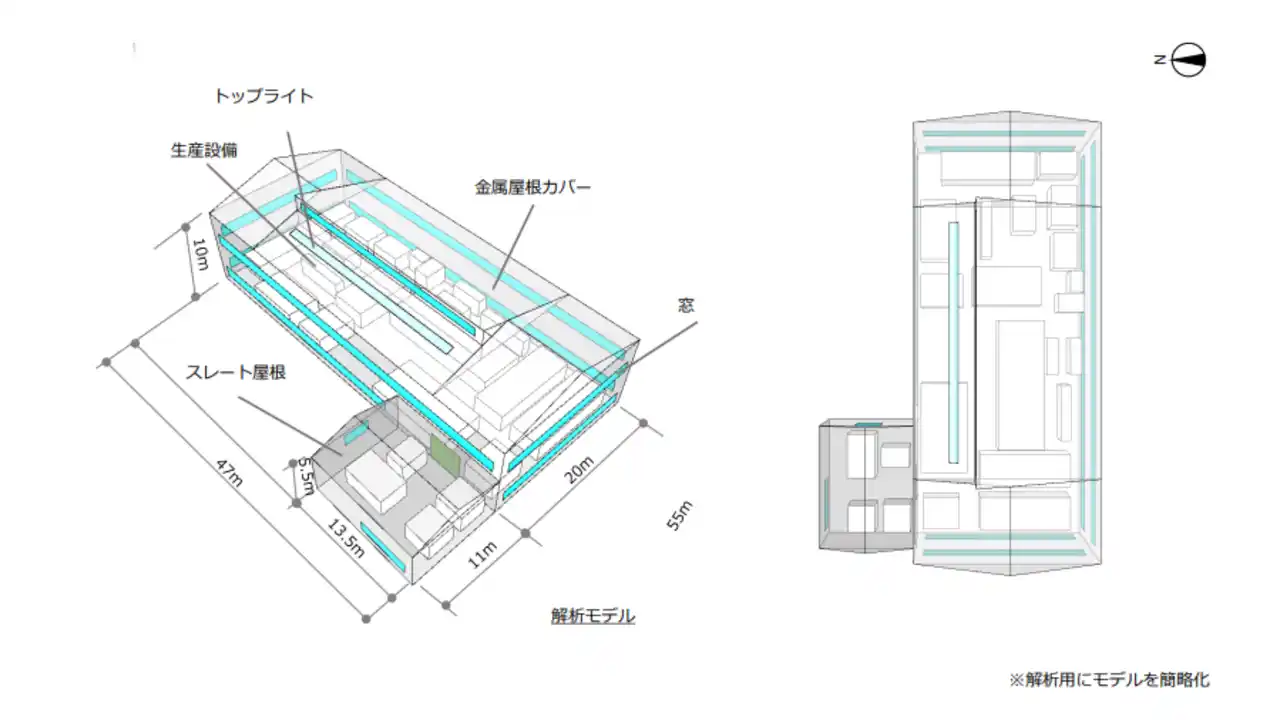 ※工場の図面をもとに作成した3D解析モデルの例。屋根構造・窓・生産設備の配置などを反映し、実際の工場に近い条件で解析を行います。 |
