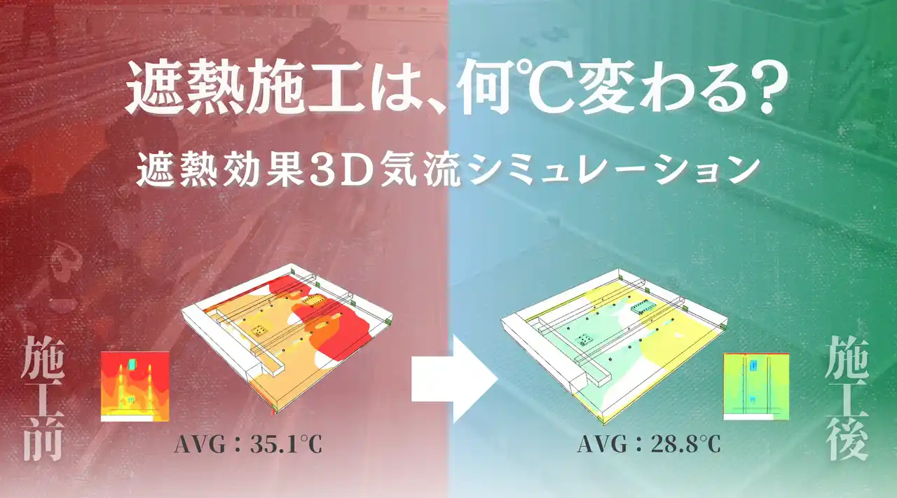 従来の遮熱施工では、施工後に初めて効果が判明するため、「どの程度効果があるのか」「屋根だけで足りるのか、壁も必要なのか」といった判断が難しく、投資に踏み切れない企業が少なくありませんでした。本サービスでは、施工前にシミュレーションで複数の施工パターンを比較し、最も費用対効果の高いプランを数値で提示します。 |