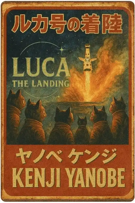 《SHIP'S CAT(HORO)-LUCA THE LANDING-》A2(40×60cm)132,000円[限定15]、A6(10×15cm)8,800円[限定20]ヤノベケンジが2025年、北加賀屋でのイベントにてタカラスタンダード株式会社の協力を得て制作したホーロー看板の複製品。 |