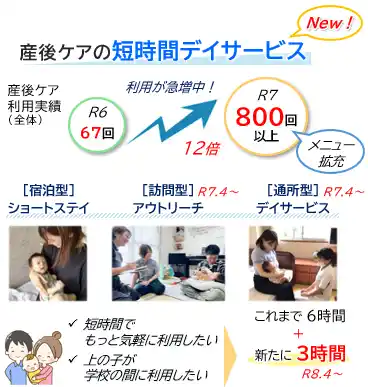 佐賀市は、子育て世帯の「短時間コースがあればいいな」ニーズに応えるため、令和8年度より、産後ケア事業に「3時間の短時間デイサービス」を新たに追加しました。 |