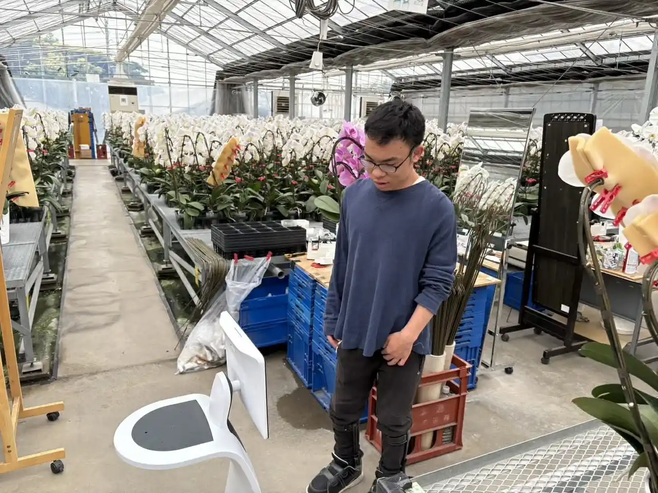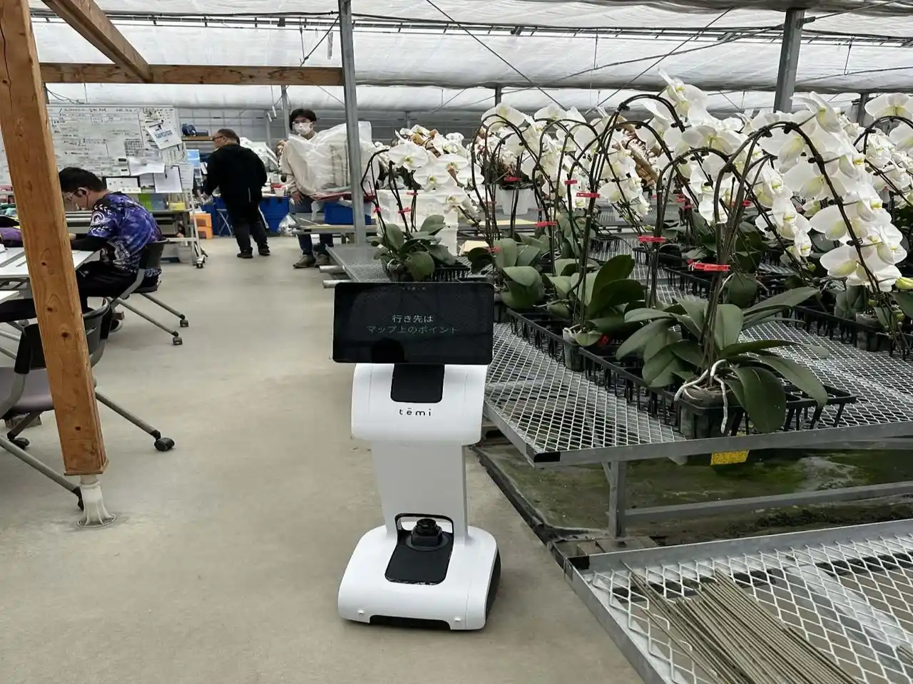 導入したAIアバターロボット「temi」は、自律走行機能を備えた移動型通信ロボットです。遠隔地にいる見学者は、自身のデバイスからロボットを操作し、広大な胡蝶蘭ハウス内を自由自在に移動しながら見学することができます。 |