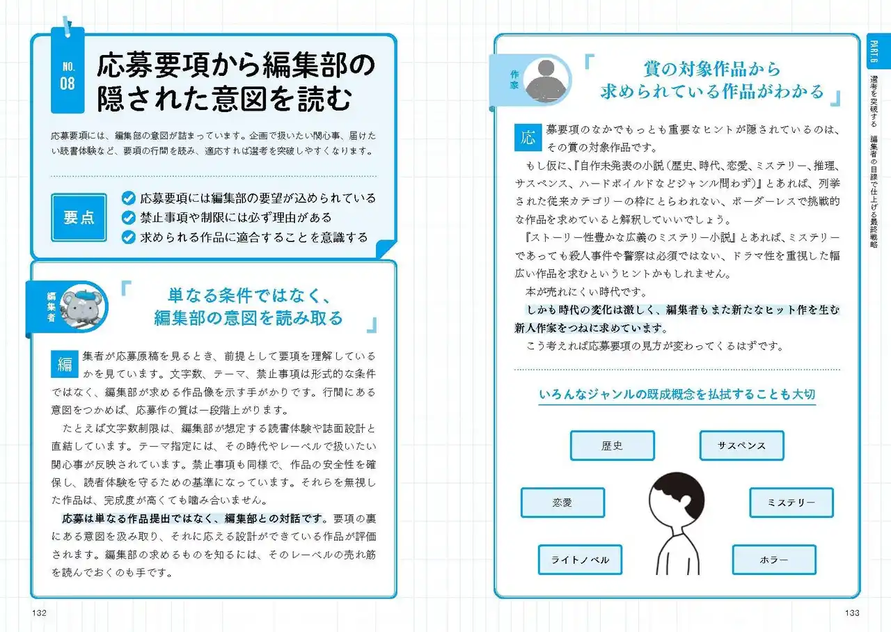 | 一方で本書が踏み込むのは、「なぜその作品は評価されるのか」「なぜ落ちてしまうのか」という、審査の裏側にある評価基準です。 | |||