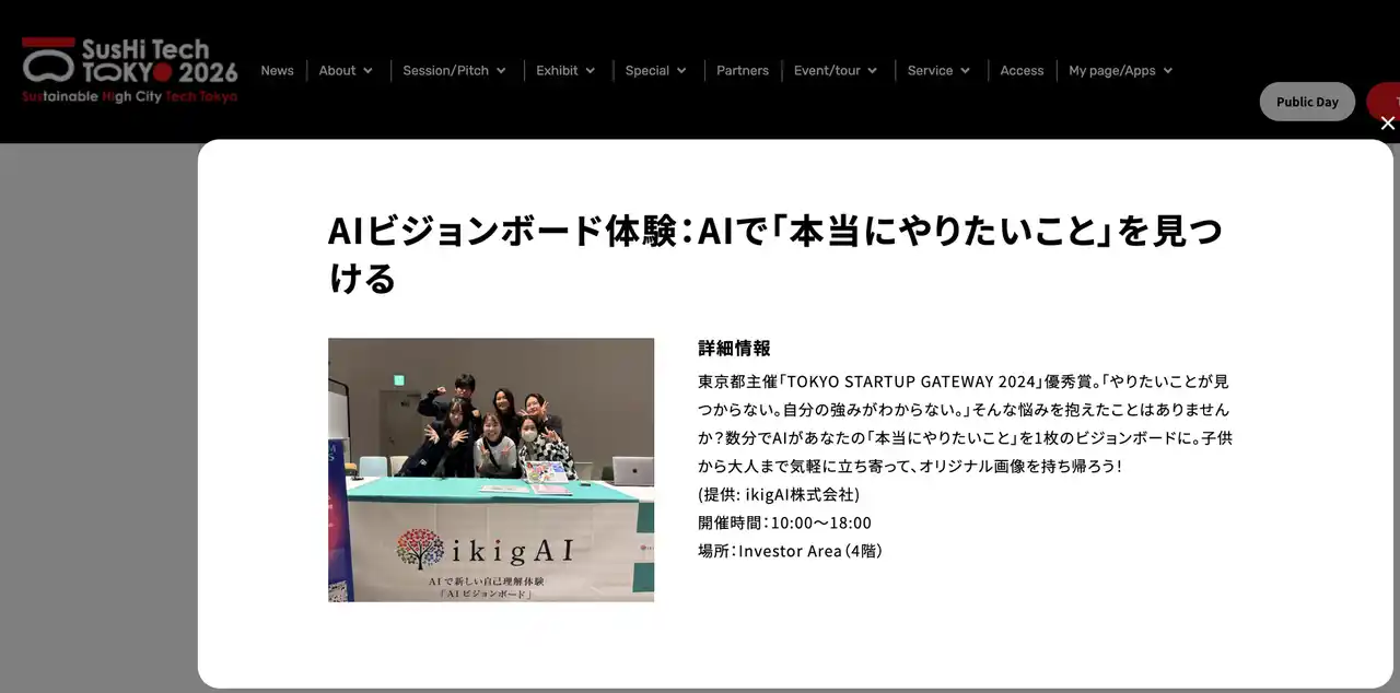 ikigAI株式会社(本社:東京都、代表取締役:外所 祐香)は、東京都が主催するイノベーションイベント「SusHi Tech Tokyo 2026」Public Dayに公式出展企業として参加することをお知らせします。 東京都公式イベントサイトの「先端技術を学ぼう」セクションに掲載されており、4月29日(水・祝)に東京ビッグサイトにて開催されます。 |