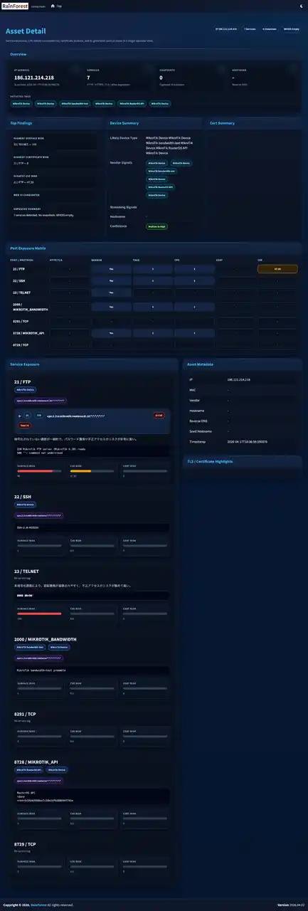 また、MikroTik向けのAPI、API SSL、bandwidth-test、Winboxなどに対する個別プローブも実装されており、汎用的なポート検知にとどまらず、機器特性に踏み込んだ調査を支援します。共通プローブではHTTP/HTTPS、SSH、Telnet、メール系、ルーター管理画面、SSL-VPNポータルなどを横断的に判定し、VPN系についてもOpenVPN、SSTP、PPTP、WireGuardのヒント検出に対応しています。 |