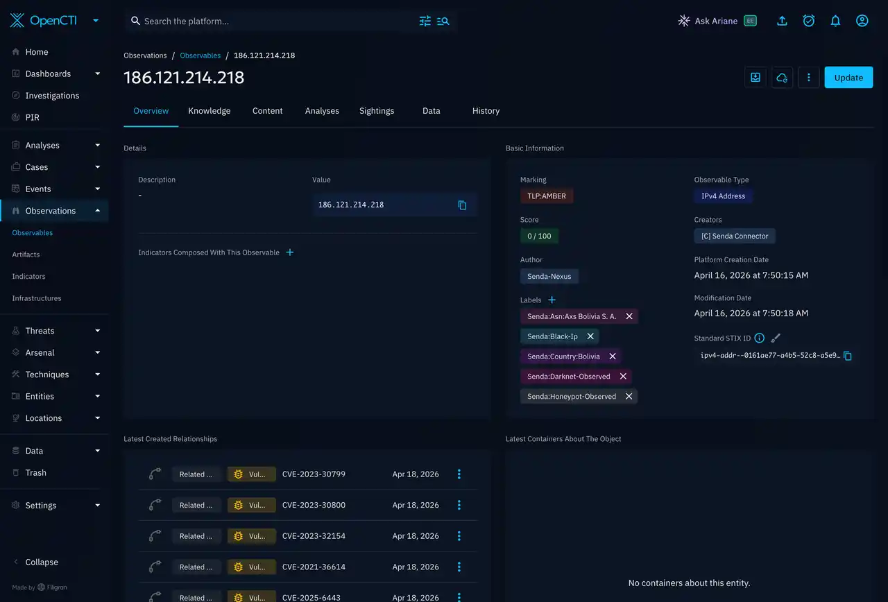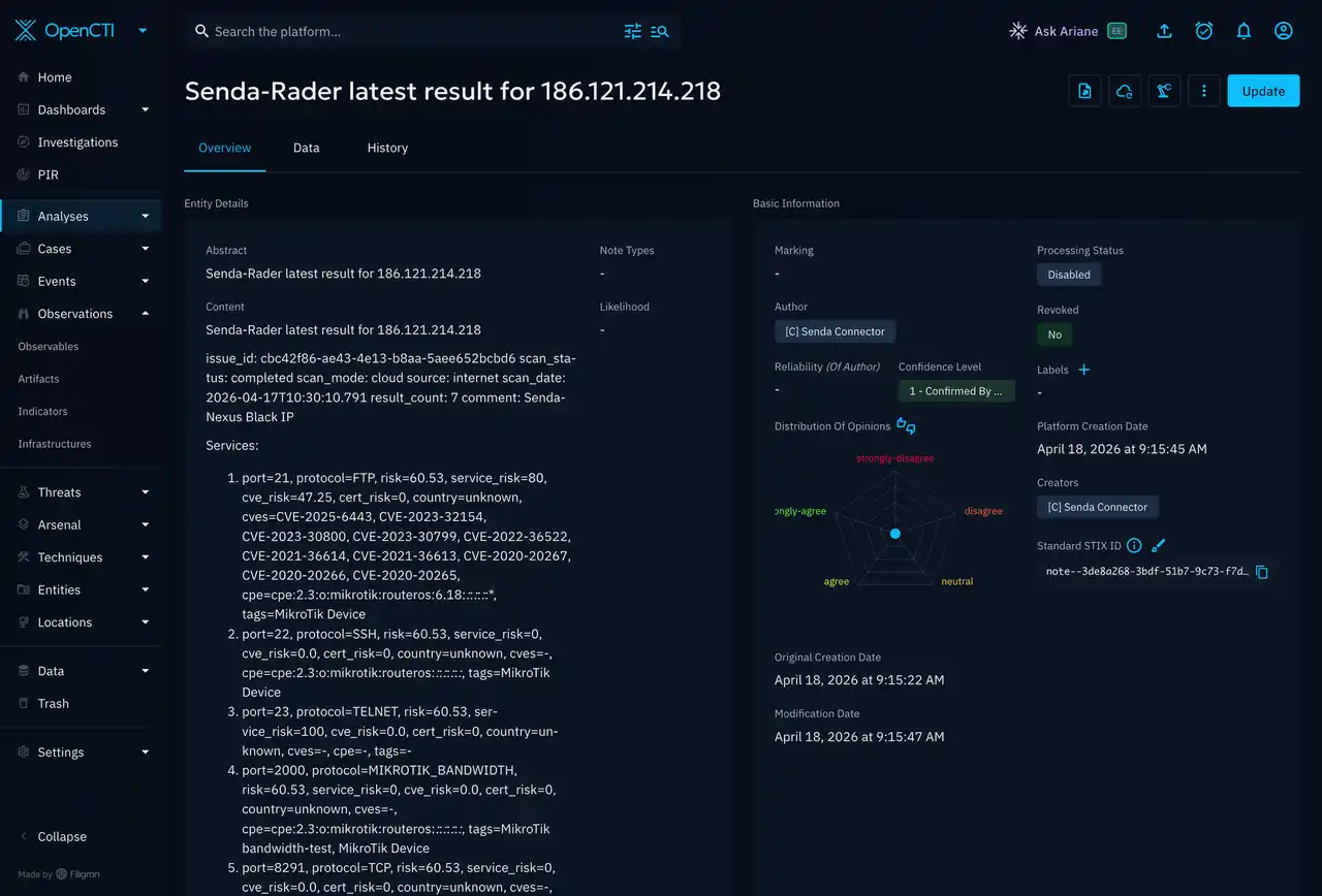Senda-Radarは、OpenCTIのEnrichment用途にも活用可能です。外部の脅威情報として配布・管理されているIoCに対して、国内観測データに基づく文脈情報を補足属性として付与し、既存のIPv4-Addr情報を強化できます。Interop向け資料でも、Senda-Nexusが保持するIP脅威情報をOpenCTIに継続的に統合し、Darknet上でのTCP SYN観測、高速スキャン観測、Mirai系挙動の有無などの観測コンテキストに加え、製品名、ポート、パス、コマンド、観測件数、国、ASNなどの情報をEnrichmentとして追加することで、SOCやCSIRT、MSSPにおけるトリアージや優先度判断を支援すると整理されています。 |