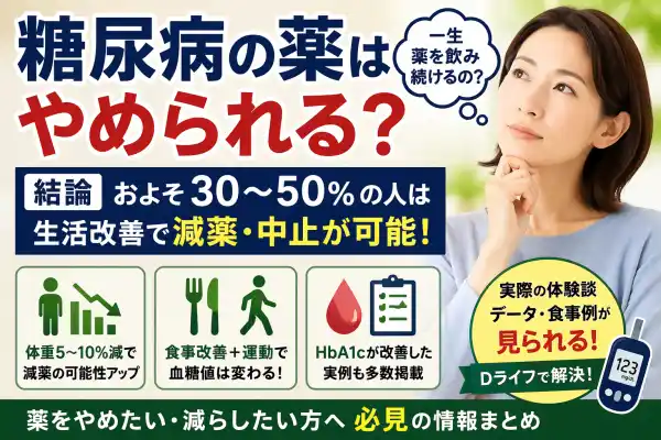 糖尿病の薬は「一度始めたら一生やめられない」と思われがちですが、実際にはそうではありません。特に2型糖尿病の場合、体重減少や食事改善、運動習慣の確立によってインスリン抵抗性が改善し、血糖値が安定すれば減薬や中止が検討されるケースがあります。