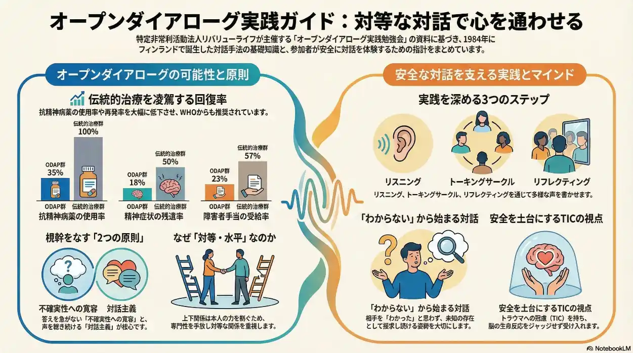 特定非営利活動法人リバリューライフは、そうした「対話の難しさ」の核心に向き合い、フィンランド発のオープンダイアローグ手法をベースとした実践の場を継続的に開いてきました。 |