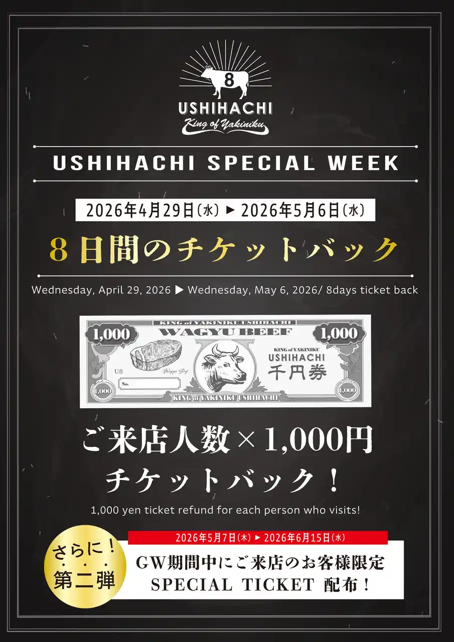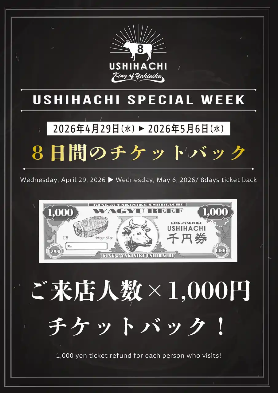 株式会社Brand Bank Company(本社:東京都新宿区西新宿、代表取締役社長:根本 寿一)の運営する焼肉店「USHIHACHI」は、2026年4月29日(水)よりGW期間限定で『チケットバック』を実施いたします。 |