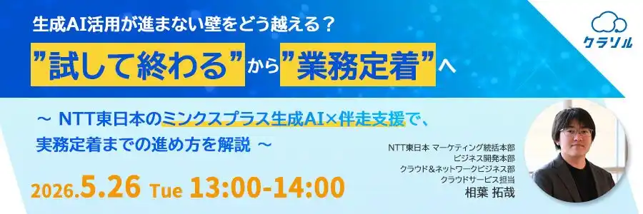■ 生成AI活用は、試行から業務定着のフェーズへ 生成AIの活用は、多くの企業で「まず試してみる」段階から、実際の業務にどう定着させるかを問われるフェーズに入っています。 文章作成や要約、アイデア出しなど、個人レベルではすでに活用が広がっており、一定の効果を感じている企業も少なくありません。 しかしその一方で、こうした取り組みが一部の利用者にとどまり、組織的な活用や業務プロセスへの組み込みにまで進んでいないケースも多く見られます。 ■ なぜ生成AI活用は進まないのか――業務定着を阻む壁とは それでは、生成AI活用が“試して終わる”状態にとどまり、業務定着まで進まないのはなぜでしょうか。 多くの企業では、活用テーマの選定、推進体制の整備、ルールづくり、現場への定着支援といった要素が十分に整理されないまま導入が進み、結果として活用が広がらないまま止まってしまうことがあります。 例えば、 「一部の社員しか使いこなせず、全社に広がらない」 「セキュリティやガバナンスの整理が追いつかず、展開判断ができない」 「PoCは実施したものの、本番業務への組み込み方が見えない」 「現場に任せきりとなり、活用が定着しない」 といった課題に直面している企業も多いのではないでしょうか。 生成AIを成果につながる取り組みにするためには、こうした壁を一つひとつ整理し、活用方針の策定から現場定着までを見据えて進めることが重要です。 ■ NTT東日本のミンクスプラス生成AI×伴走支援で、業務定着までの進め方を解説 本セミナーでは、生成AI活用を“試して終わる”状態から脱却し、実務に定着させたい企業様に向けて、NTT東日本の「ミンクスプラス生成AI」と伴走支援をもとに、実務定着までの進め方を解説します。 NTT東日本は、「実務で“すぐに使える”生成AI活用」をコンセプトに、ユースケース整理、活用方針策定、ハンズオン支援、ガイドライン整備など、導入前後の検討から定着支援まで一貫してサポートしています。社内データを活用できるテンプレートや、ノーコードで構築可能な生成AIチャットボット環境を通じて、検索・要約・文書作成など日常業務への活用を支援してきました。 さらに、新しくリリースされた複数AIが連携するマルチAIエージェント機能により、社内データの検索・整理から文書化までを役割分担で実行できます。これにより、複雑な資料作成や検討業務など、従来のAIやシングルコンシェルジュでは難しかった業務での活用の可能性についてもご紹介します。 生成AI活用が進まない壁をどう乗り越え、業務定着と成果創出につなげるのか。その具体的な考え方と進め方をご紹介します。 ■ こんな方におすすめ ・生成AIを導入したものの、活用が広がらず課題を感じている方 ・“試して終わる”状態から、業務定着へ進めたい方 ・生成AI活用の推進役として、全社展開やルール整備を担っている方 ・成果につながる生成AI活用の進め方を具体的に知りたい方 ■主催・共催 NTT東日本株式会社 ■協力 株式会社オープンソース活用研究所 マジセミ株式会社 |