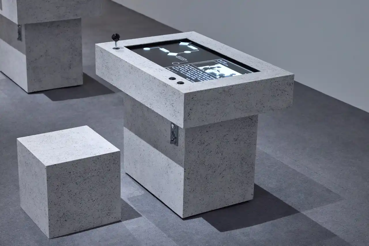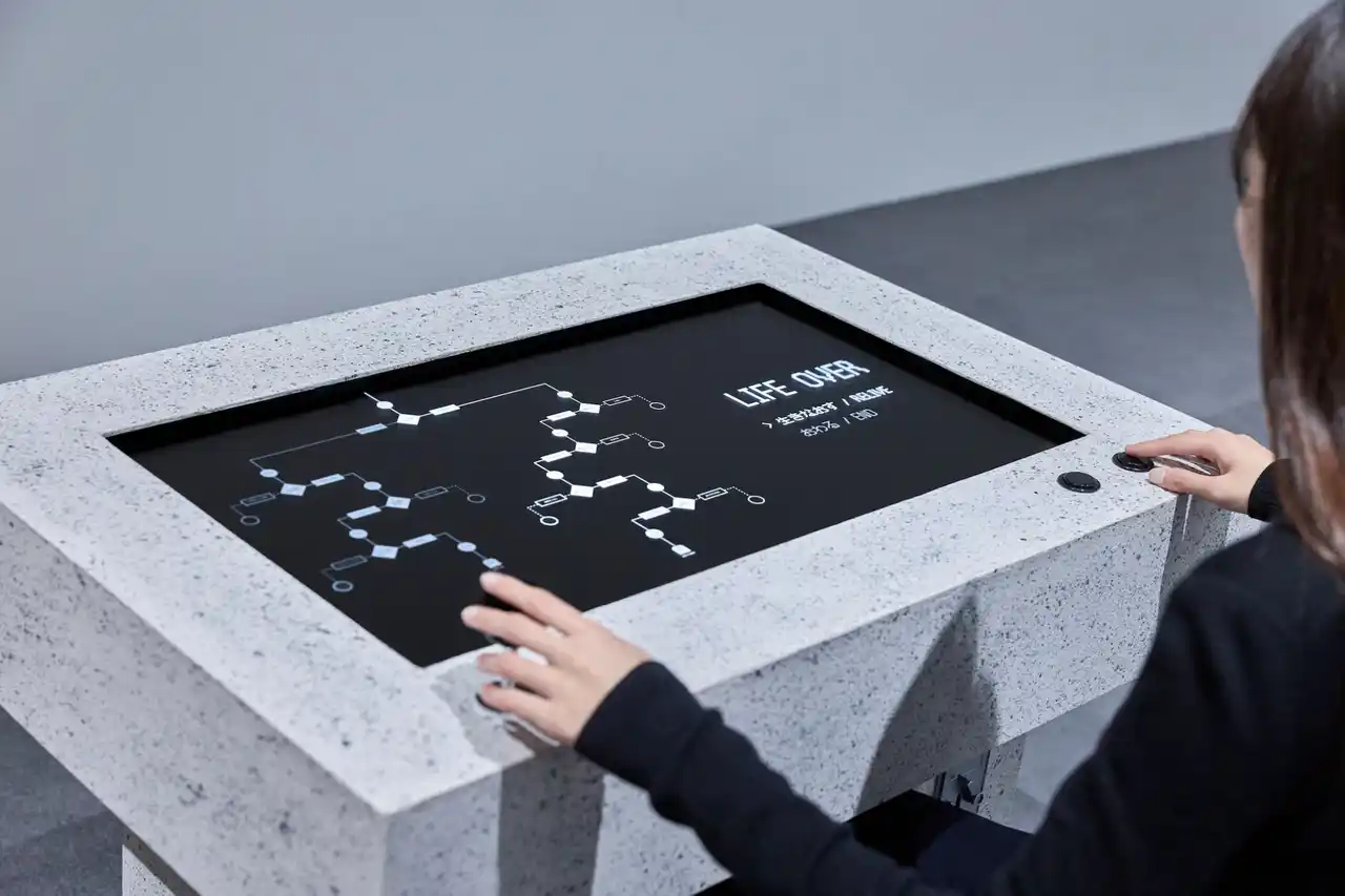 《ありうる人生たちのゲーム / Game of Possible Lives》は、ある個人の人生の選択を始まりから終わりまで行う作品です。プレイヤーはその個人の人生における結婚、キャリア、家族といった大きな岐路で選択を重ね、その決断がもたらす結果を最期まで体験します。ゲーム内の出来事の文章は、筐体内でローカルに稼働する大規模言語モデル(AI)が、統計データを参照しながらリアルタイムに生成しています。社会の膨大なテキストデータによって作られる大規模言語モデルが生成する世界は、不条理や偏見も含めて現実社会の反映となり、この時代を生きるということの「体験的なアーカイブ」として機能します。 |