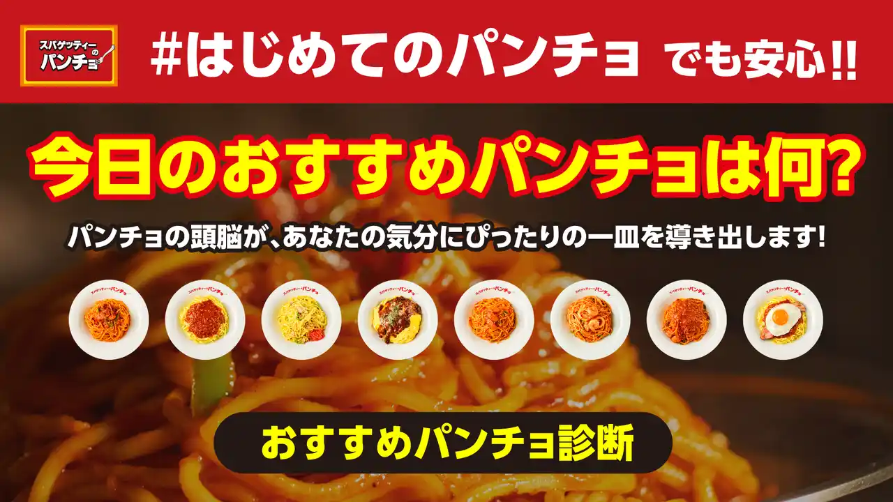 | 「自分に合った一皿が選べないよー」というパンチョ初心者のみなさんも安心してご来店いただけるように、春のナポ祭り開催に合わせて『おすすめパンチョ診断』を開発しました。はじめてのパンチョの方も、今日の気分でスパゲッティーを選んでみたい方も、ぜひ「おすすめパンチョ診断アプリ」を気軽にお試しください! | ||||||||||||||||||