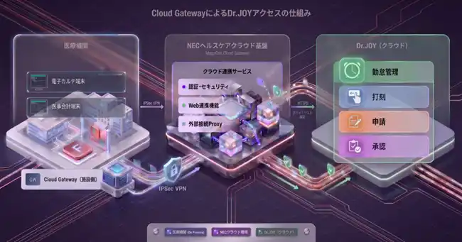 今回の「NEC MegaOak Cloud Gateway」との連携により、その壁は取り払われます。医療従事者は、使い慣れた電子カルテ端末から離れることなく、Dr.JOYの「勤怠管理」にダイレクトにアクセス可能となります。「現場の導線の中に、テクノロジーが自然に溶け込むこと」これこそが、私たちが掲げるミッション「すべての医療従事者に、次の一手を。」を体現する、重要なマイルストーンです。 |