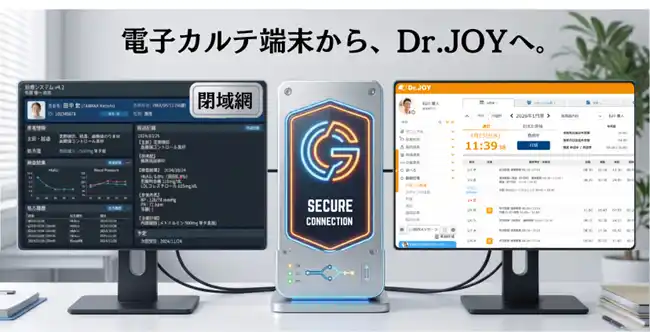 Cloud Gatewayを通じて、閉域網環境にある電子カルテ端末からDr.JOYの各機能にセキュアにアクセスできます。すでにCloud Gatewayが稼働中の施設であれば、追加のハードウェア設置は不要です。 |