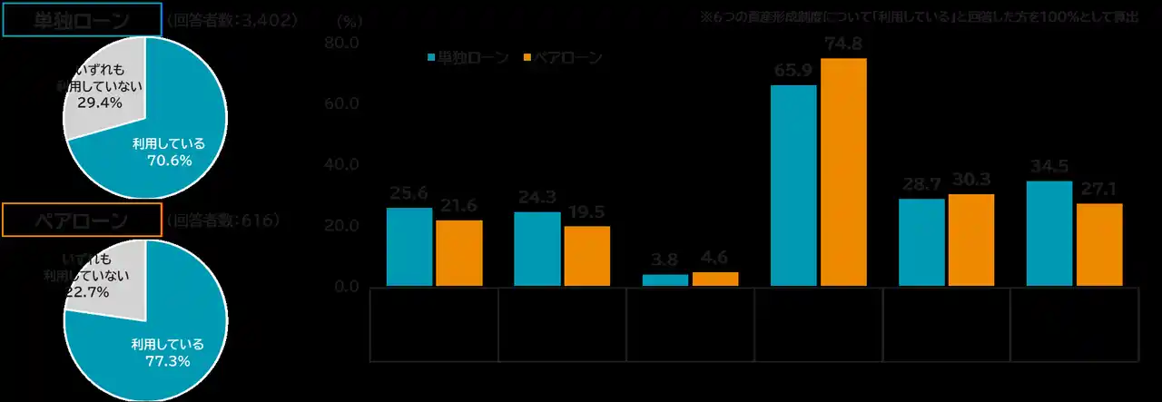 また、その中でも最も活用されているのは、NISA(少額投資非課税制度)で、利用率は単独ローン世帯で65.9%、ペアローン世帯で74.8%と、いずれも非常に高い利用率ではあるものの、ペアローン世帯が8.9ポイント高い結果となりました。 |