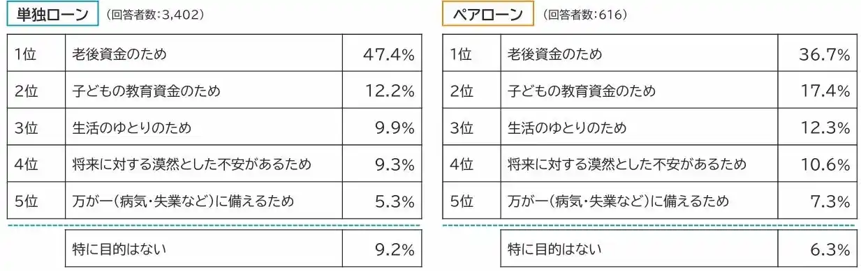 ※回答者:住宅ローン返済中かつ借入形態(単独ローン・ペアローン)が分かる方のうち資産形成に向けての取り組みを行っている方 ※以下の選択肢から資産形成(貯蓄や投資など)を行っている最大の目的を選択:「老後資金のため」「子どもの教育資金のため」「住宅購入(リフォーム)のため」「住宅ローン繰上返済のため」「住宅ローン金利上昇に対応するため」「万が一(病気・失業など)に備えるため」「生活のゆとりのため」「インフレ対策(物価高対策)のため」「将来に対する漠然とした不安があるため」「その他(自由回答)」「特に目的はない」 |