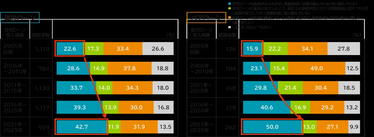 その一方で、同じ世帯年収帯で比較した場合、ペアローン世帯では、より高い水準で資産形成を行っている世帯の割合が高いことも事実です。借入金額が大きい中にあっても、ライフプランを土台に、制度を活用しながら返済と資産形成の両立を図っている点は、ペアローン世帯の特徴的な側面と言え、こうした姿勢は将来の返済条件や家計の変動といった不確実性への備えにもつながるものと思われます。 |