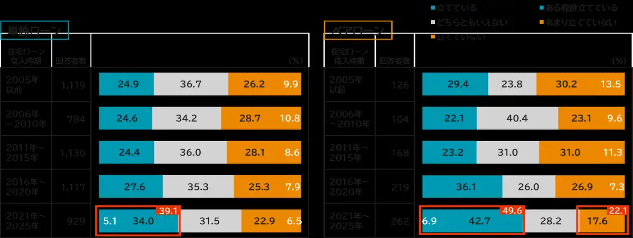 なかでもペアローン世帯においては、その傾向がより顕著です。2016年以降、ライフプランを策定している割合は大きく上昇しており、2021年~2025年では「立てている・ある程度立てている」が49.6%と、およそ半数に達しています。この割合は、同時期の単独ローン世帯よりも10ポイントほど多い結果となっています。 |