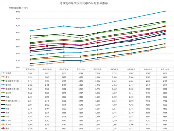 地域ごとの年間支給総額の平均は下表のように推移しており、令和3年以降はすべての地域で継続的に上昇していることが見て取れます。 |