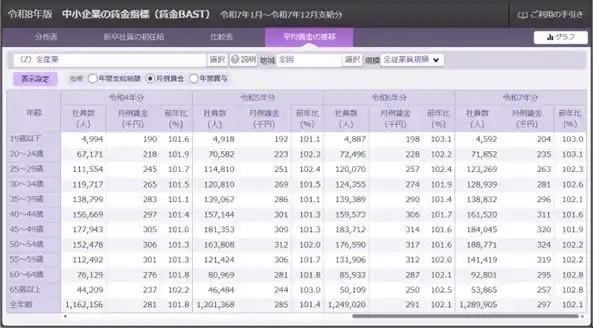 <令和8年版「中小企業の賃金指標(賃金BAST)」の平均賃金の推移の画面> |