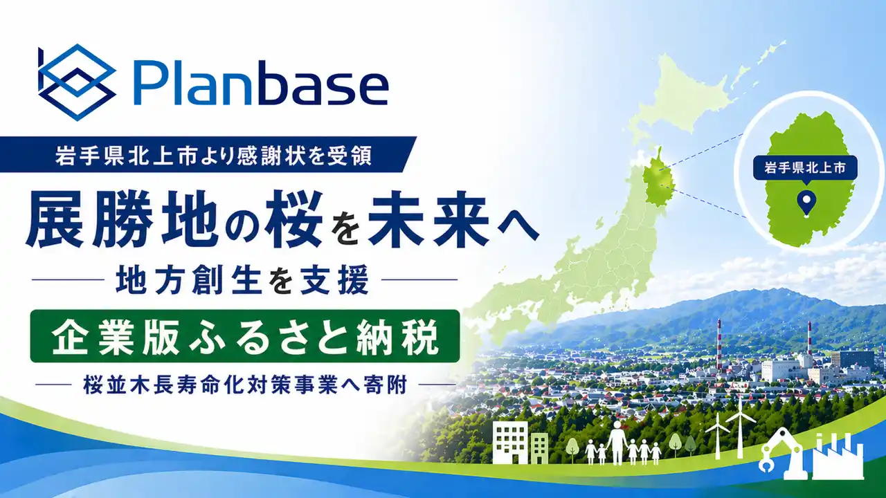 中小企業向け経営・補助金コンサルティングを手がける株式会社プランベース(本社:東京都千代田区、代表取締役:武衣 貴志)は、岩手県北上市に対し、「企業版ふるさと納税(地方創生応援税制)」に基づく寄附を行いました。本寄附は、同市の「展勝地桜並木長寿命化対策事業」を支援するものであり、2026年4月23日に北上市役所本庁舎にて開催された贈呈式において、北上市長より感謝状を受領いたしましたので、お知らせいたします。 |