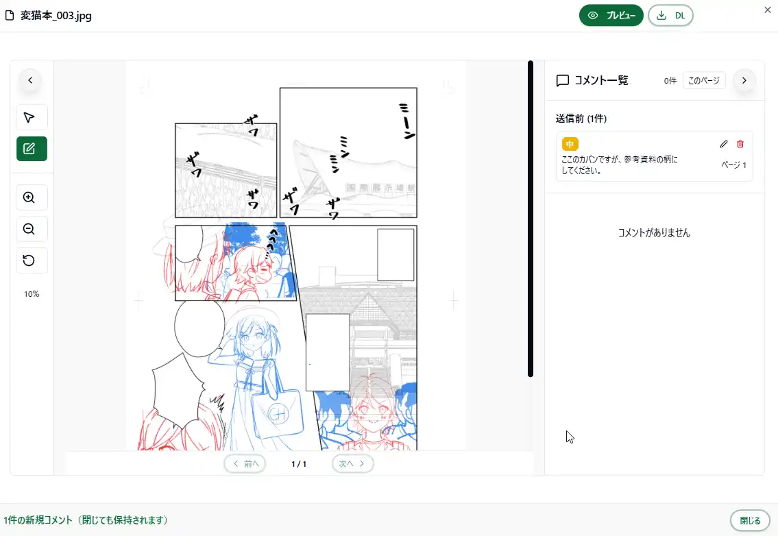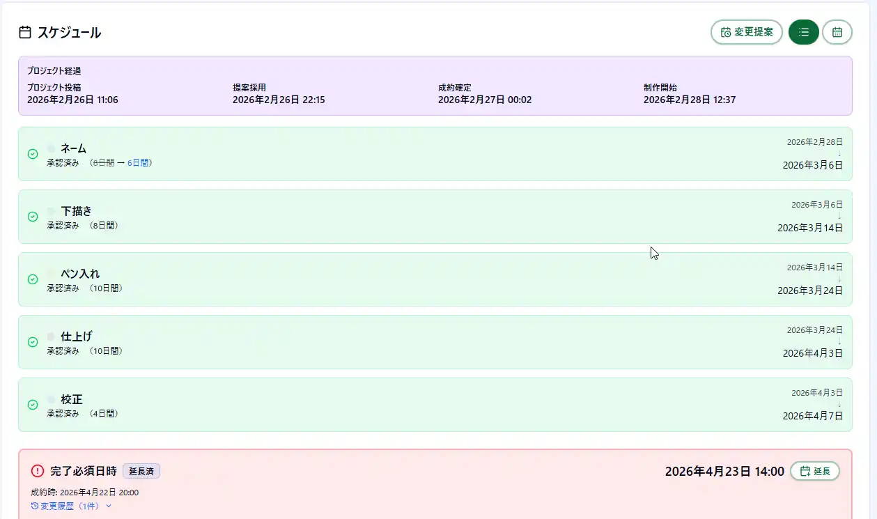 条件整理(ページ数・納期・権利)から、ネーム制作・清書・修正指示まで、すべてをプラットフォーム上で完結。 初めての漫画制作でもスムーズに進行できます。 |