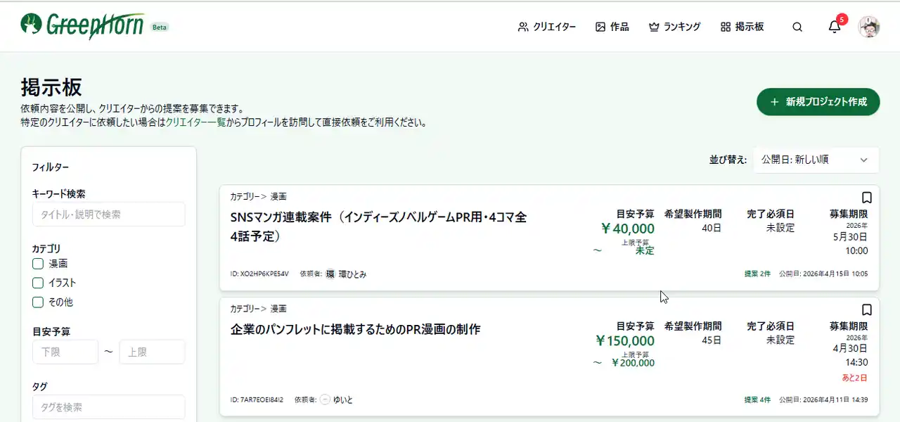 | GreenHornでは、無料でクリエイターの検索および依頼条件の作成が可能です。 | |||||||||
