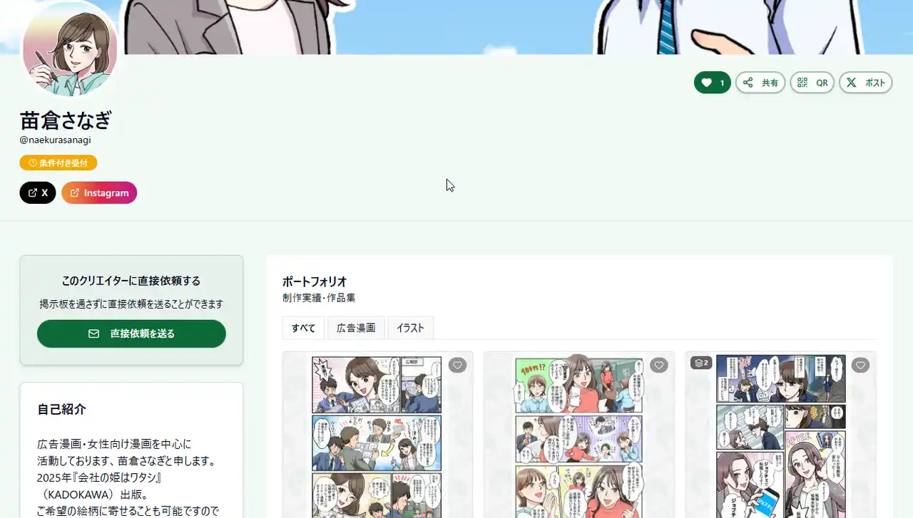 4. 依頼方法を選べる柔軟な発注スタイル ご自身で見つけた漫画家に直接依頼できる「直接依頼」と、案件を募集できる「掲示板」機能の両方をご用意しており、目的や制作スタイルに応じて、最適な依頼方法を柔軟に選択いただけます。 |