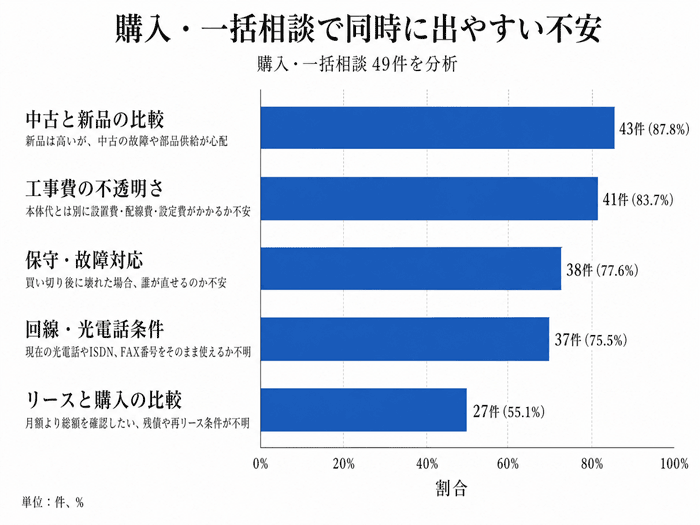 | 購入・一括相談で同時に出やすい不安として、中古と新品の比較が43件、工事費の不透明さが41件、保守・故障対応が38件、回線・光電話条件が37件、リースと購入の比較が27件確認されました。 | |||
