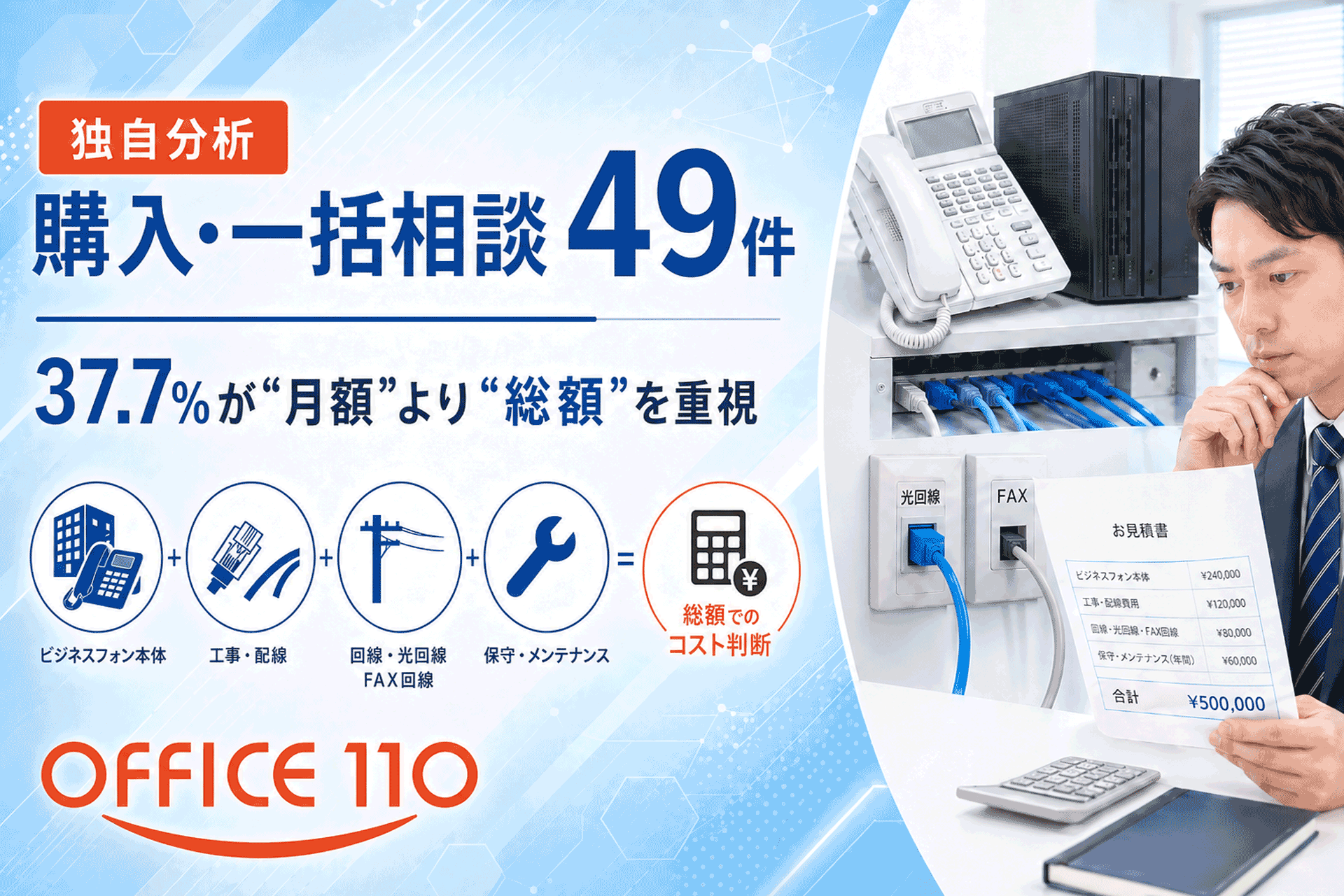 | FFICE110の長期相談データをAIで分析したところ、ビジネスフォン導入に関する相談のうち、購入・一括に関連する相談は49件確認されました。構成比は37.7%です。 | |||