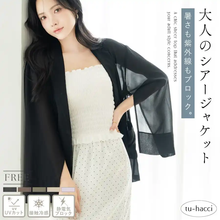| 株式会社WaterAir(本社:広島県広島市 代表取締役:國安秀之輔)が運営するインナーファッションブランド『tu-hacci(ツーハッチ)』では、2026年4月28日(火)より、トレンドのシアー素材に接触冷感・UVカット加工・静電気防止機能を備えた「接触冷感シアージャケット」の販売を開始いたします。年々厳しさを増す日本の夏に向け、おしゃれを楽しみながら日差し・冷房対策、さらに体型カバーまでを一枚で叶える、インナーブランドならではの視点を落とし込んだ新作アパレルです。 | ||||||||||||