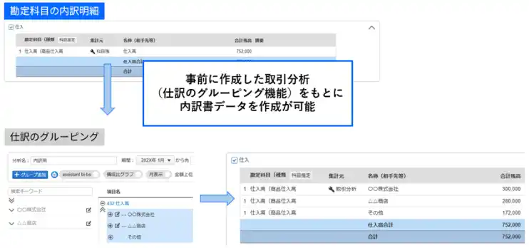 特に、勘定科目内訳明細書については、補助科目や取引先を管理していない場合でも、bixid内に存在する仕訳のグルーピング機能を活用することで、内訳集計の効率化に寄与することが可能です。 |