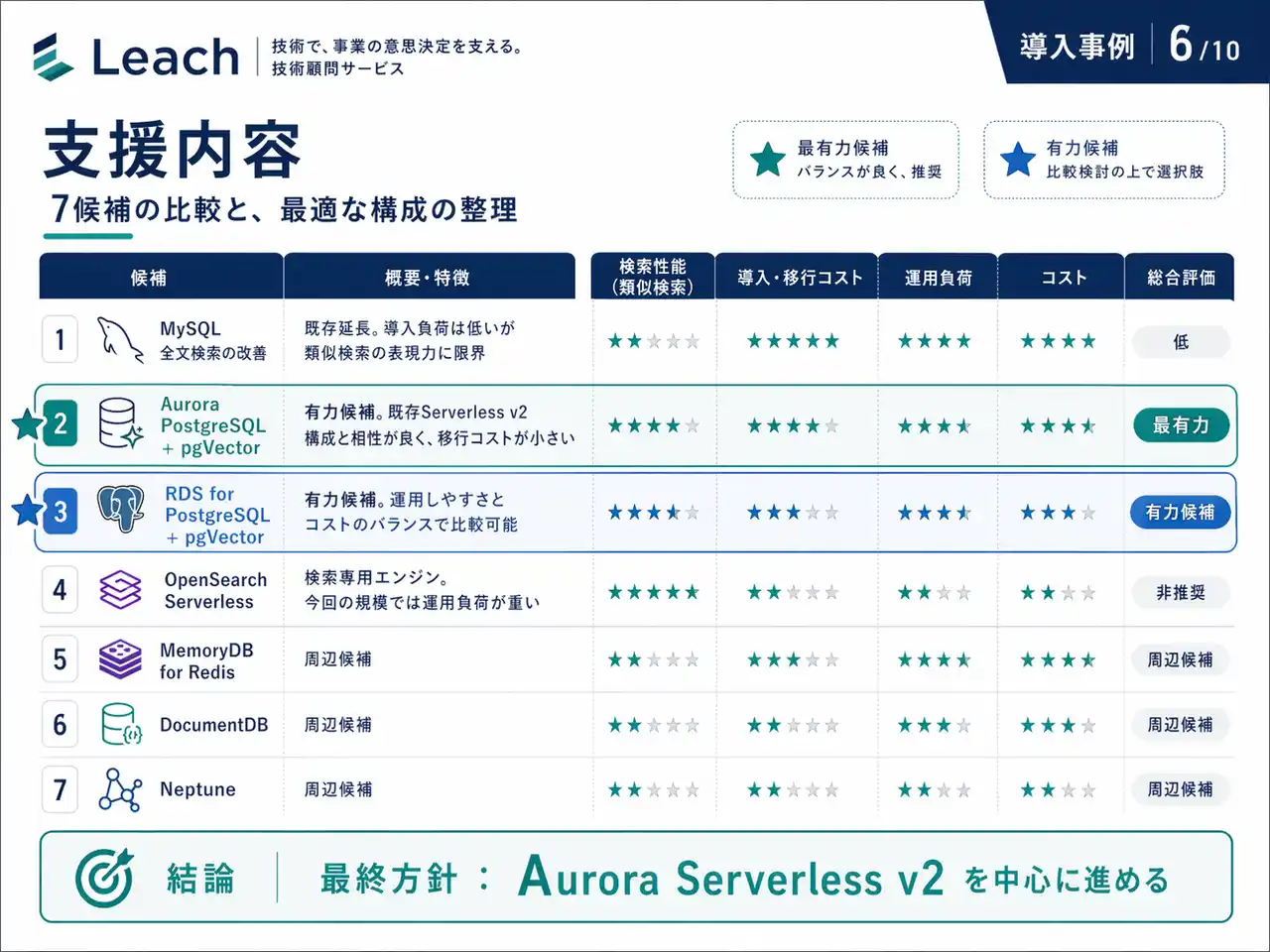 7候補→1案:MySQL全文検索/Aurora PostgreSQL+pgVectorなど、コスト・運用負荷・要件適合で比較 |