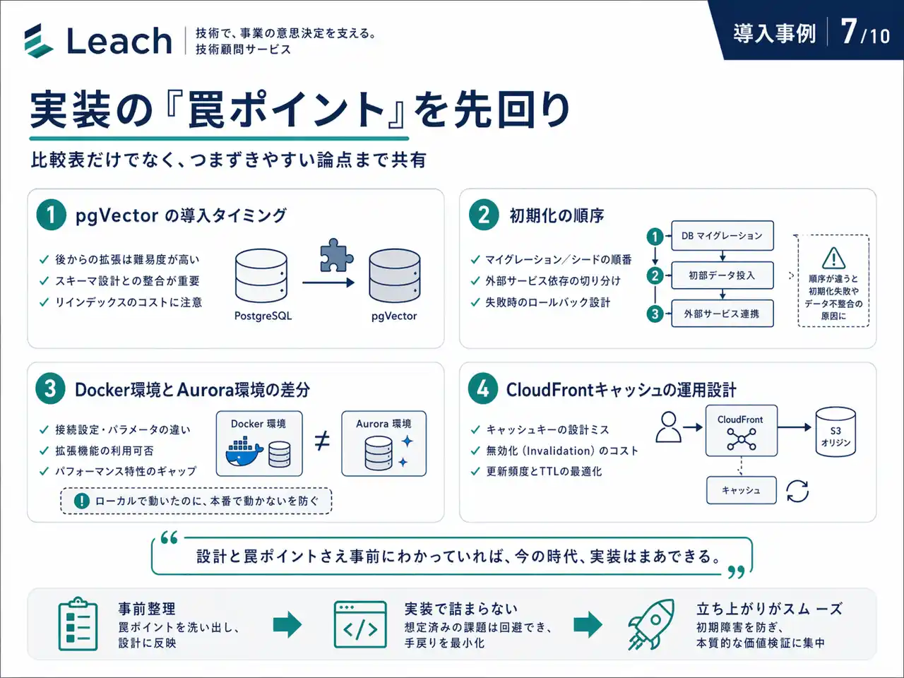 さらに Leach は、比較表だけでなく、実装で実際にハマりやすい論点を事前に共有しました。pgVector の導入タイミング、初期化の順序、Docker 環境と Aurora 環境での差分、そして CloudFront キャッシュの運用設計まで。単なる技術調査ではなく、「実装でつまずく場所まで先回りする」支援になっていました。 |