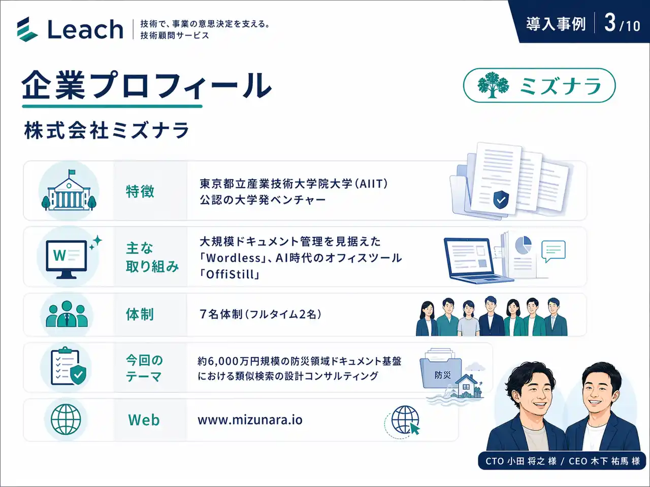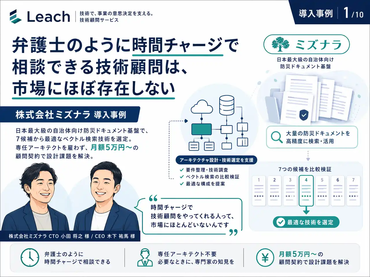 日本最大級の自治体における防災ドキュメント基盤 ── 約6,000万円規模・3年契約の案件で、数千ページの文書に対する「類似検索」をどの技術で実現すべきか。専任アーキテクトを雇うほどではない、でも社内だけでは決め切れない。この隙間を埋める形で、株式会社ミズナラは Leach 生成AI顧問を活用しました。CTO 小田 将之 様、CEO 木下 祐馬 様にお話を伺います。 |
