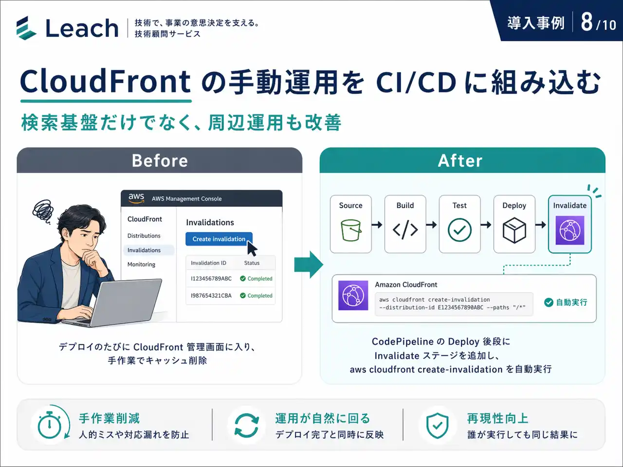 CodePipeline の Deploy ステージ後段に Invalidate ステージを追加し、aws cloudfront create-invalidation を自動実行する構成を整理 |