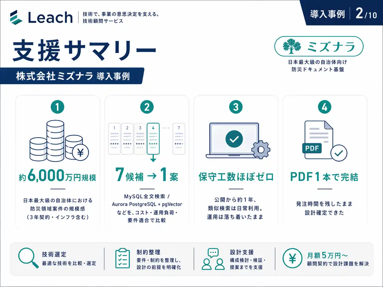 ※本記事で紹介する防災領域の取り組みには、ミズナラの前身体制で行われたプロジェクトを含みます。本文中の約6,000万円規模という記載は、当該取り組み全体(インフラを含む)の規模感を示したものであり、Leach の顧問料や保守契約の金額を指すものではありません。公開上の配慮から、顧客名や一部の固有情報は伏せて記載しています。 |