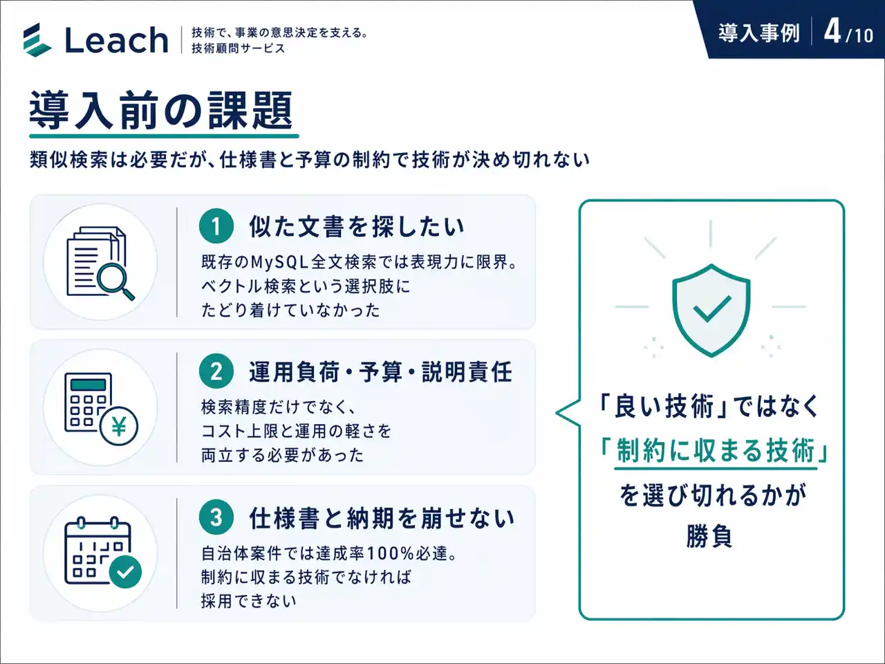 2. 導入前の課題 ── 類似検索は必要だが、仕様書と予算の制約で技術が決め切れない |