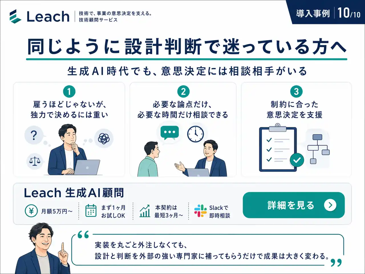 「雇うほどじゃないが、独力で決めるには重い」── 中小規模の開発チームで頻出するこの局面に、Leach 生成AI顧問は月額5万円~、まず1ヶ月お試しから入れます。 |