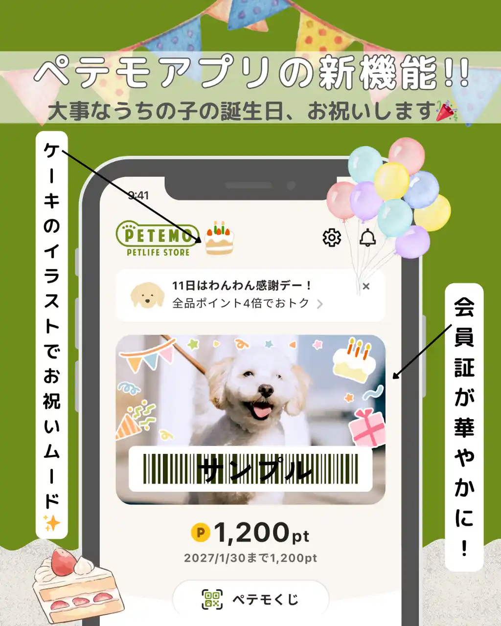 アプリに登録されているペットの誕生月になると、会員証の券面(写真部分)に1か月間、誕生日を祝うケーキやプレゼントなどの可愛らしいイラストが自動でデコレーションされます。 |
