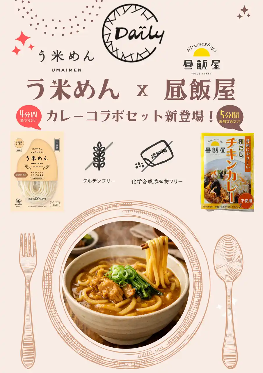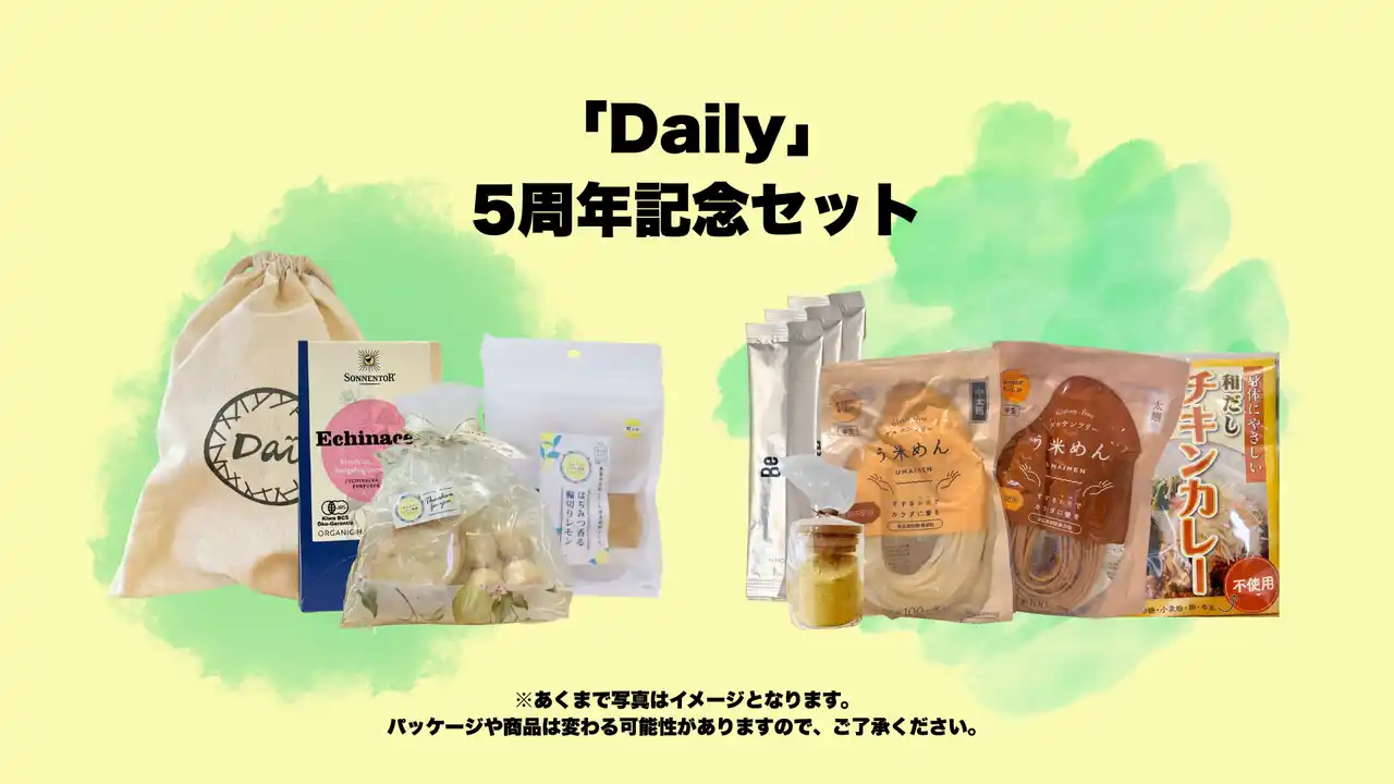 「Daily」(東京都品川区大井町)は2026年5月2日にオープン5周年を迎えます。これを記念し、日頃の感謝を込めてゴールデンウィーク期間中に特別イベントを開催。店頭では、お米でできたグルテンフリー麺「う米めん」の試食会を実施するほか、数量限定の5周年記念セットを販売します。ゴールデンウィーク期間中は21時までオープンする日もございますので、ぜひ店頭にお立ち寄りください。 |