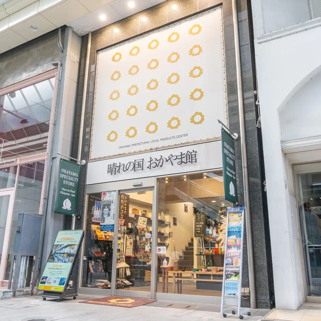 岡山市北区表町にある晴れの国おかやま館の店舗では、1,100円(税込)ごとのお買い物で、次回利用できる200円分のクーポンを進呈。楽しいイベントも盛りだくさんで日常のお買い物からお土産需要まで、幅広く活用いただけます。 |