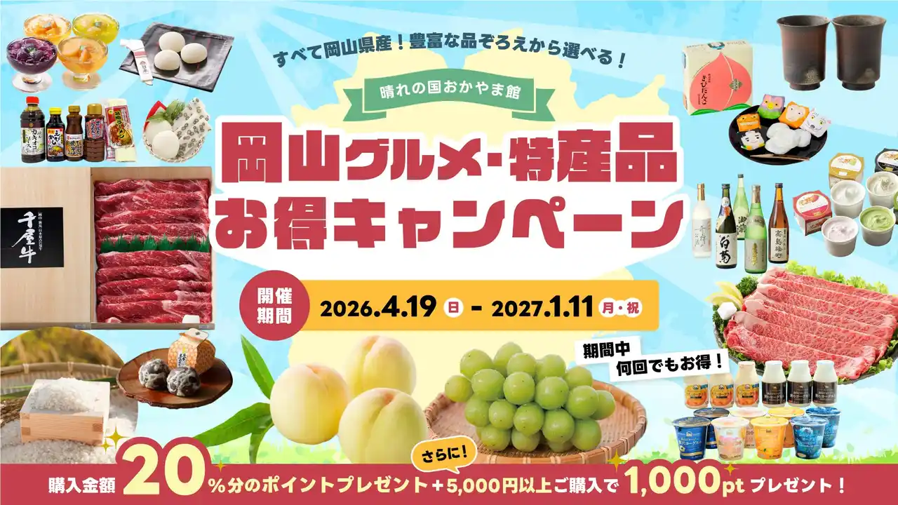 公益社団法人岡山県観光連盟が運営する「晴れの国おかやま館」では、物価上昇や消費環境の変化に対応し、県産品の消費喚起・販売促進を図るため、2026年4月19日(日)から2027年1月11日(月)まで、『岡山グルメ・特産品お得キャンペーン』を開催中です。 |