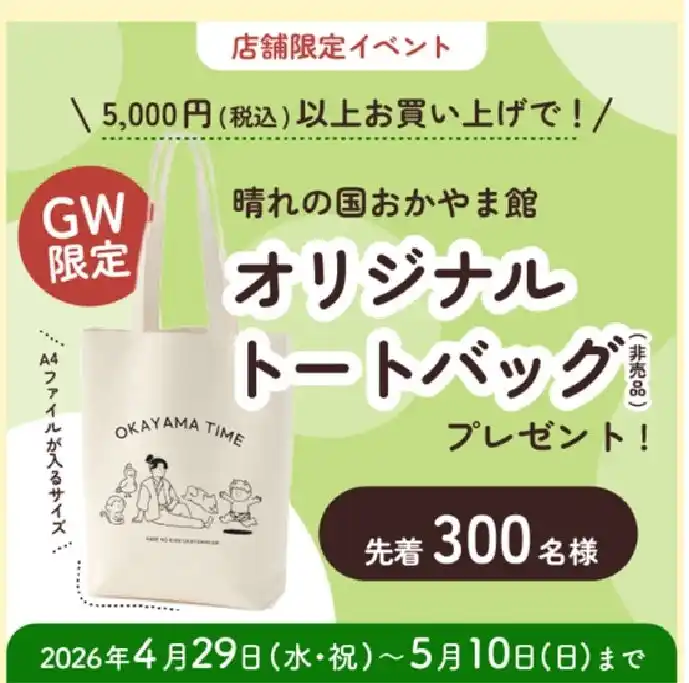 GW限定!税込5,000円以上のお買い上げで、かわいい桃太郎たちのイラストが入ったオリジナルトートバッグ(非売品)をプレゼント!日常使いしやすいシンプルなトートバッグで、岡山の“いいもの”とともに思い出もお持ち帰りいただけます。 |