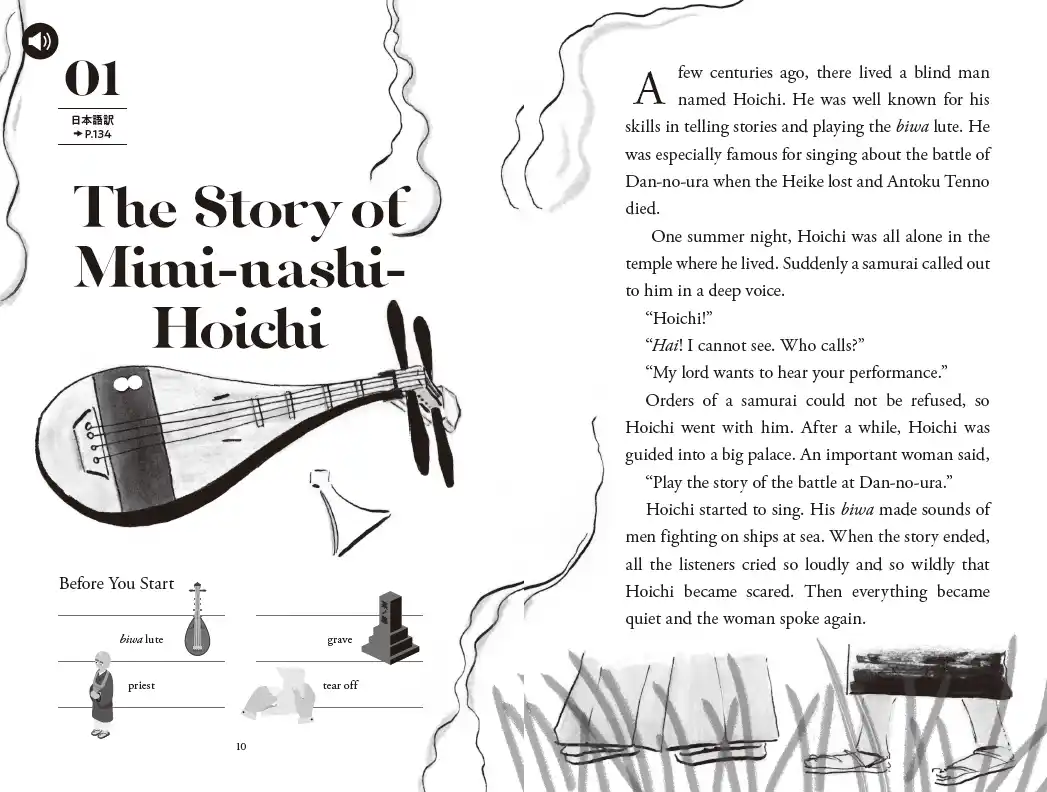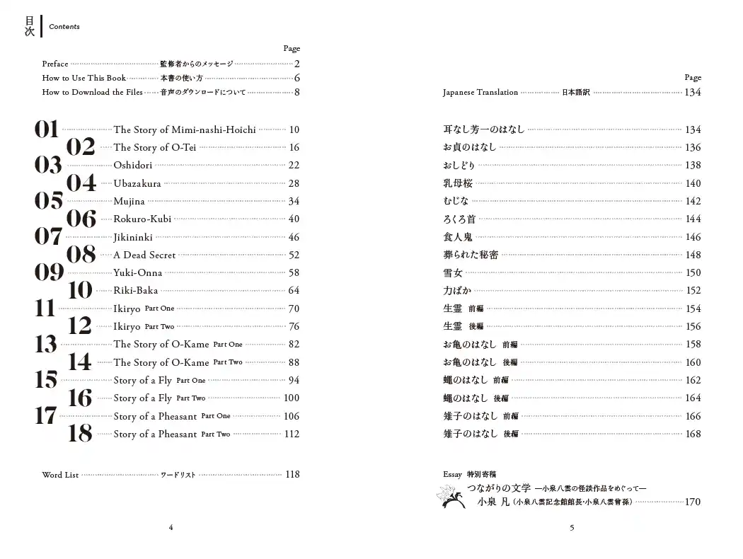 『音声DL BOOK Enjoy Simple English Readers Japanese Ghost Stories from Lafcadio Hearn 小泉八雲が愛した日本の怪談』では2025年度に番組で放送した、「小泉八雲が愛した日本の民話」から18話を厳選してお届け。小泉八雲が書いた英文を、高校レベルの英語に書き下して掲載しています。和訳つきなので、復習にもぴったりです。