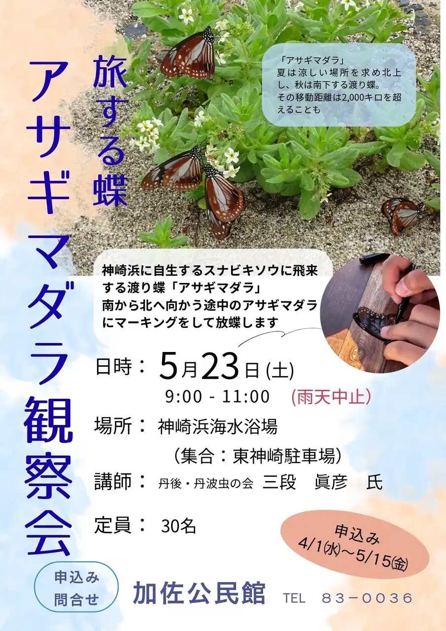 舞鶴市加佐公民館は、5月23日(土)、神崎浜海水浴場にて「旅する蝶 アサギマダラ観察会」を開催します。 |