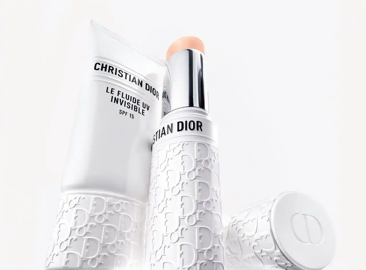 | ディオール オブリークのロゴモチーフがデザインされた、清潔感あふれるホワイト パッケージを纏ったインビジブル UV フルイドとインビジブル UV スティックは、紫外線ケアを、これまで以上に魅力的なルーティンへと昇華させます。 | |||