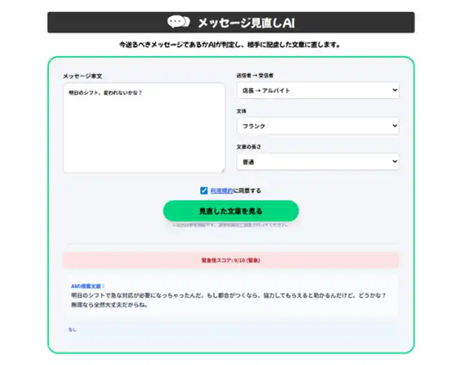 店舗管理者・アルバイト従業員双方が利用可能です。送信者の立場を選択し、伝えたいメッセージ内容を入力するだけで、AIが相手への配慮とビジネスマナーを兼ね備えた適切な文章を生成します。 |